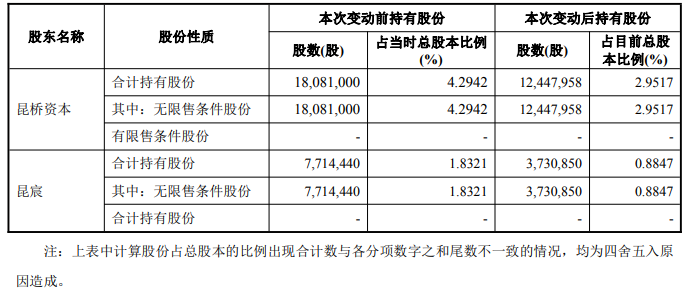 星宸科技于2025年9月29日披露的关于公司股东减持计划实施情况暨减持完毕的公告显示,近日,收到公司股东昆桥资本及其一致行动人昆宸出具的《关于股份减持计划实施完毕的告知函》,截止2025年9月28日,在减持计划实施期间,昆桥资本与一致行动人昆宸通过大宗交易和集合竞价方式累计减持公司股份9,616,632股,持有公司股份比例下降至3.8364%,减持情况与此前已披露的减持计划一致,减持数量在减持计划范围内。