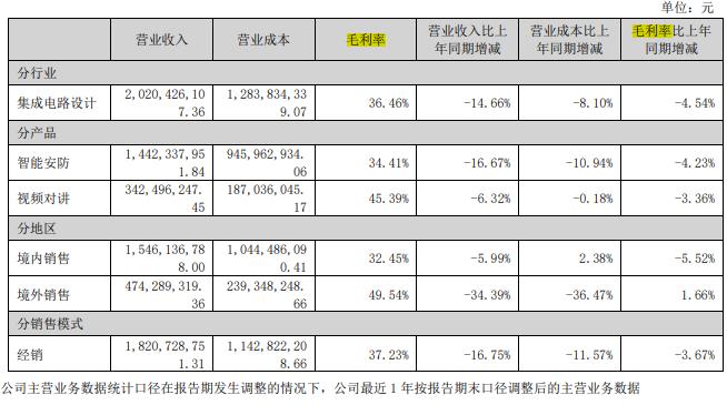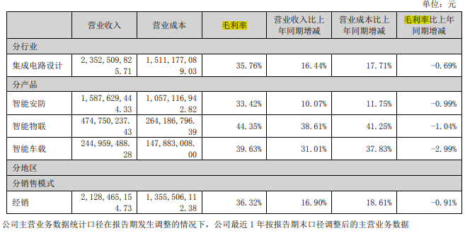 2024年,公司整体毛利率约35.79%,同比下滑0.67%。分行业来看,公司集成电路设计毛利率35.76%,同比下降0.69%。分产品来看,公司智能安防毛利率33.42%,同比下降0.99%;智能物联毛利率44.35%,同比下降1.04%;智能车载毛利率31.01%,同比下降2.99%。
