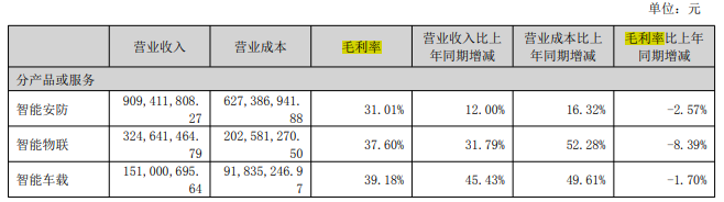 2025年上半年,分产品或服务来看,公司智能安防毛利率31.01%,同比下降2.57%;智能物联毛利率37.60%,同比下降8.39%;智能车载毛利率39.18%,同比下降1.70%。
