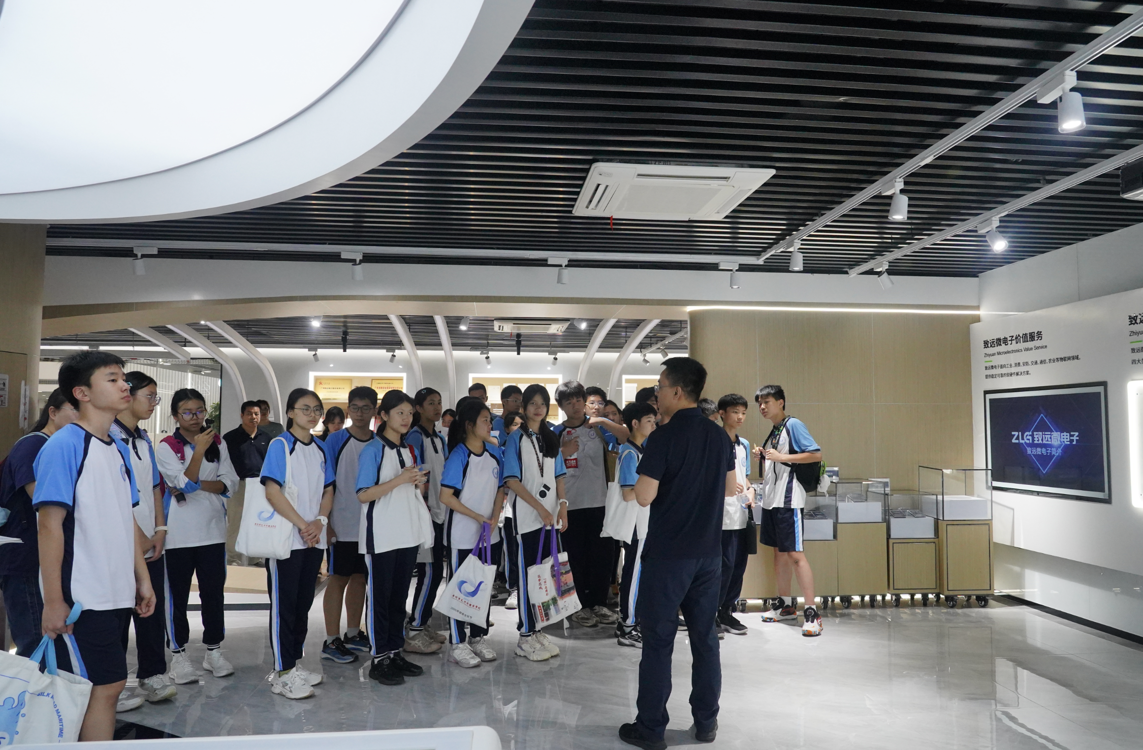 在致远电子,工业智能物联的硬核技术让同学们瞪大眼睛。工程师讲得通俗易懂,前沿科技不再高不可攀。“原来电路板上的小芯片,能控制一整座工厂!”一名男生兴奋地拉着同学讨论。