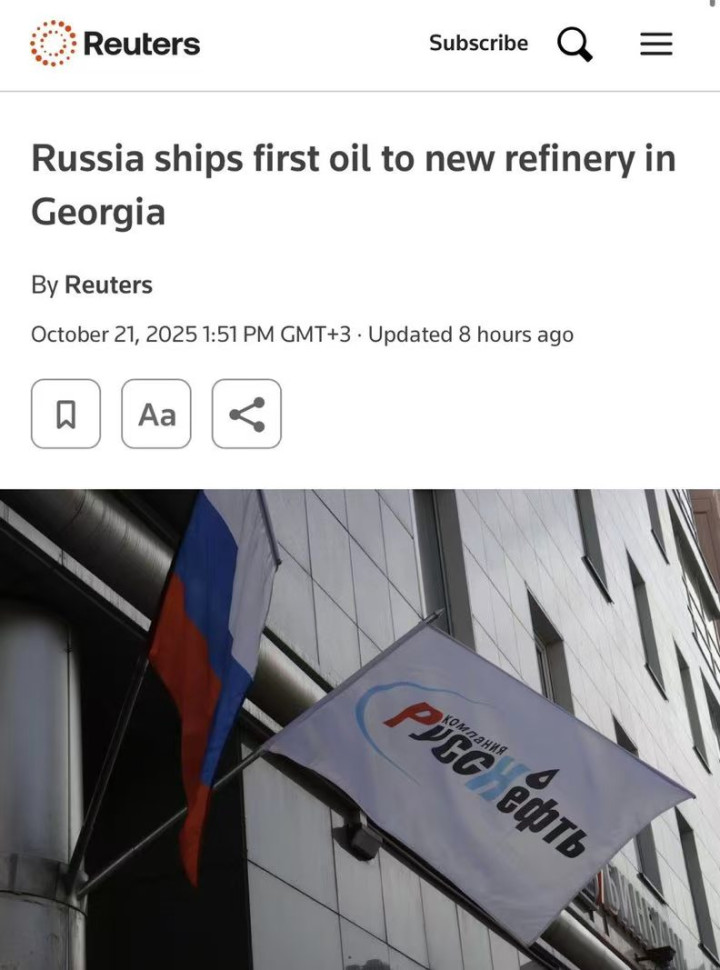 路透社:在乌克兰军方对俄罗斯工厂进行大规模无人机袭击后,俄罗斯石油公司首次向格鲁吉亚库列沃的一家新炼油厂运送俄罗斯石油。